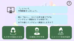 Participants become the protagonist of a fictitious company and are in charge of new business development. Participants can acquire more practical skills by making their own choices and taking action in a series of processes such as market research, product development, presentation, and human resource management.