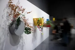 The corner exhibition is one of the features of the Ryuseiha ikebana exhibition. Nine diverse corners will be on display, including paneled works hanging on the walls, works decorating windowsills, works that float fantastically in the light from below, and works using two types of pillars, red and white, 30 cm in diameter and 2 meters high, as their focal points.