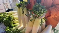 You can take home as many daikon radishes as the number of leaves you grab and lift with both hands for 5 seconds. This is a very popular event that requires a lot of arm strength!