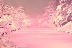 Snow piled up on the branches of cherry trees is lit up. Enjoy the fantastic sight of cherry blossoms that look as if they are in full bloom.