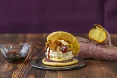 A generous amount of whipped cream with sweet potato paste is topped with a crunchy sweet potato topping. The dorayaki is topped with a rich caramel sauce, and is available only during the season.